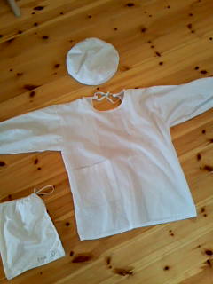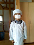 洗濯物をたたんでいると、とあるモノを発見。 homaの給食当番のカッポウ着! わーナツカシー。 ナツカシかったのと、実際に見てみたかったので。 じゃーん。着せてみました♪ お。カワイー♪ご飯よそってん。