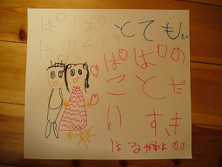 ある日、会社から帰ると・・・ ppのPC卓に手紙が・・・ コレは・・・ 恋文? 幼稚園での延長保育?での作品らしく、今まで娘に傾けてきた愛情が、間違っていなかった証。 なんちて。 あぁ、娘も最高♪