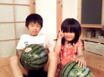 会社にて。 夏バテ対策としてスイカ1玉をいただきマシタ。 同僚の独身者から、一人じゃ喰えんから。 と、もう一玉入手。 得意気に家に帰ると、そりゃもうhomaharu大喜び♪ スイカと記念撮影。 しばらくデザートには困らない♪