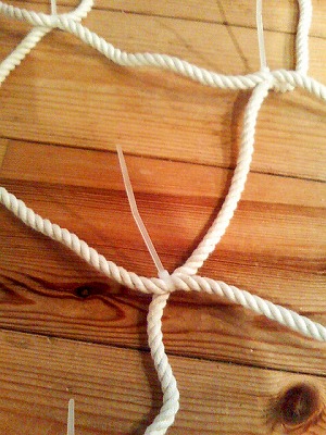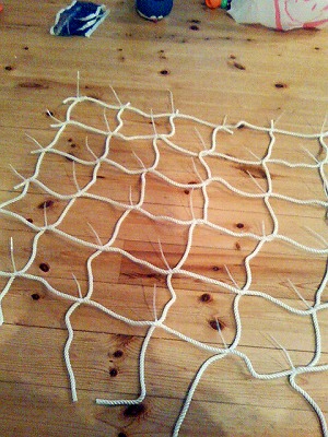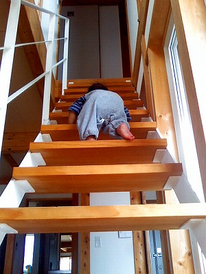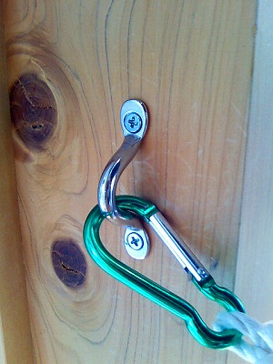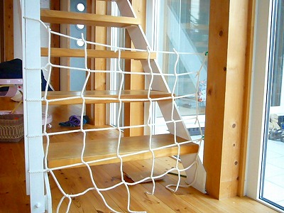 cocoも9ヶ月になります。 スクスクと成長してくれていますが、やはり色々と安全面で問題がでてきます。 そんな危険な箇所の一つが・・・ 階段。 お兄ちゃんお姉ちゃんにつられて、登りはじめ・・・ついには登頂に成功しました。 落ちる側への対策も必要ですが、まずは生活拠点のリビングからの登り対策を講じます。 んで、毎度の如く百円均一へ。 なるべく太めの綿ロープ(写真なし)を購入。 (以前はもっと太くて長かったのに・・・不況ですな。) それを階段の横幅より大きめに切り、数本に分けます。 それを結束バンドで、だいたいの等間隔で固定。 こんな謎の物体をつくります。 いや、どうみても網ですね。なんて、へへ。 これを階段にとりつけると・・・こうなります。 もうちょい仕上げが必要だけど、目的は達成できそうです。 網の固定は、片側は階段手摺への結束バンド固定。 開閉部分には、柱にキズをつけちゃいますが、フックをネジ固定し、カラビナでひっかける感じにします。 ロープ ¥100×2 カラビナ ¥100 固定フック ¥100×2 網(ネット)って、あんまり流通してないのでやり始めたのですが、 計500円・・・。もうちょい安く作りたかったかなぁ。