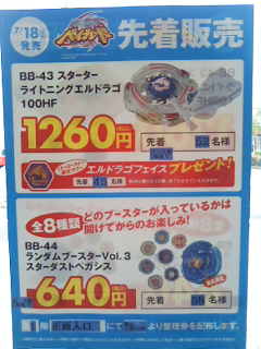 7/18(土)待望のエルドラド発売覚醒日。(おはスタ風に。) 開店45分前にイトーヨーカドー刈谷店に着く。 正面入り口へ向かうと・・・ ! 先客がいるではないか! しかも結構な数!! うひー。買える? 先日店頭で確認したビラで、整理券での先着販売告知有り。 しかも、エルドラゴ紫フェイスのオリジナル特典付き。 こいつのせいか・・・。 それでも! なんとか整理券GET~! 28番目♪ 混み合うレジも何とか済ませ、 先着45名までのフェイス特典もGET~! 折角?なので、ppもあわせ、2個購入。 ダークブルの発売時は、こんな混雑一切なかったのに・・・ エルドラゴだから? 告知や広告があったから? (ベイブレード暦の短いppには謎。。。) あー、小学4年生にファミコンを買う為、jjと正月早々オモチャ屋に並んだ事を思いだしました。。。 さて、旧製品の便乗販売?も、結構な品揃え。 今回、珍しくベイポインター単品が販売されてたよう。 ・・・メタルフェイスは今回も買えず。。。 ホント、イケズな奴め。。。