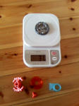 新発売のベイ。 独特な形状でアッパー攻撃。 えー。違います。 量りデス。 1g単位からの計量が可能な、調理用(mm)の量りデス。 なぜベイブレードに? サツキパパさんのご指摘で、改造時のセッティング重量を”改造★能力CHECK表”に盛り込む為、各パーツの計測するため~ デス。 こんな感じで1パーツ毎に。 大変。 でもタノシイ♪