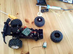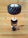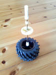 まずは、コアとなる動力部から手をつけてみます。 動力源は、モーター×電池。 子供達のオモチャ箱から引っ張りだしてきたのは・・・ ラジコン! 1000円均一で購入するも、初期不良でバックしか出来ない困ったヤツ。 それでも無理に前進させようとしてたら、基盤から煙が吹き出したりして。 (バカバカしくて返品もしなかった・・・) そんな彼にも遂に日の目が! と、思いきやあっという間にバラバラに。 ゴメンね。悪いけどppが欲しいのは、 彼の心臓と・・・ もう一つは・・・ 脚のみ。 ホイールとシャフトを組み合わせ、こんなの↓を作りマシタ。 こんなの。 上部(タイヤがついてる部分)・・・スタジアムの回転部を回す支柱。 下部・・・支柱を支える土台。 この2部分をシャフトがつなぎ、間に歯車を設けています。 この歯車にモーターから動力を送り、スタジアムを回転させる。 が、動力部のコンセプト。 あとは、モーターの設置か。 現在までの製作COST・・・0円也。(え?ずるい!?)