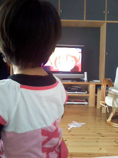 homaが漫画を読みふけっている頃、haruちんは。 ソファでニュースを見てたppの所に来て、 「haruちゃん、プリキュア見たいって言ってたよ。」 いやいや、ppは知らないよ。 「(じゃあ)プリキュア見たいな」 pp無言で唇で”チュッ”と音を鳴らす。 haruちん、心得た!とppの体によじ登りChu! ppリモコン操作し、プリキュアを再生。 念願のプリキュア。 「ミユキの怒り!もうダンスは教えない!?」 ・・・お話のタイトルも完璧に復唱。 何回おんなじ話を見ているのだろう。。。