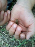 サッカークラブは某小学校のグランドで練習しているのだが、 裏の田んぼの用水路にうじゃうじゃカエルがいるのを発見。 一歩歩けば、10匹くらいのカエル(チビ)が跳ねる。 それが50mくらい続くのだ・・・。 サッカー後、homaも用水路へ。 かなりすばしっこく、捕まえるのに苦労したようだが、コツをつかんだか。 何匹か捕まえ始めた。 ちっこいカエル。でもppは触らない。 全身黄緑なのがレアカエルとなり、皆探し始めたりして。 来年のおたまじゃくしはココに捕まえにこようかな。