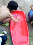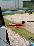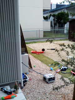 朝。 亀のおもちゃをカエルプラントに入れると、homaが庭へ。 当然haruもついていく。 リビングから、ふと庭を眺めると・・・。 なんだアレは? ・・・。 拡大。 裸族? 雪ソリの上に裸で寝そべるharu・・・。 しかも水入り。 あ、もう一人ラ族発見。 ソリにおたまじゃくし入れて、またすくってる・・・。 ラ族。刈谷に出没するらしい。