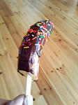 できたチョコバナナがこれ↓ なかなかではナイデスカ。 ふんがっ。 ようやく食べれてご満悦~。 口の周りをベトベトにしながら、バナナ4本分完食~。 バナナじゃなくてもいいね。次はイチゴ!?