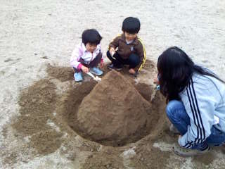 GWというのに、昨日に引き続き今日も雨。 ところがPM1時頃。 日が出始める! すると突然、mmとhomaharuが外に遊びに行くと言い出す。 あのー、さっきまで雨降ってたのですけど・・・。 止める間もなく飛び出す3人。 近所の公園まで追いかけてみると・・・。 わーなんか作ってるー。 砂場でお城?を作製中。 小雨が降り出したので、傘を取りに一度家に戻ると・・・ あれ?二人で作ってる。haruは!? あ! いた!花を愛でるharu発見! こんな楽しそうなモノを見せられて大人しくするppではありません。 トンネル作りに参戦! じゃーん。完成!! お堀に橋まで架けて~天辺には特大プリン!? 雨が強くなってきたので・・・帰ります・・・。