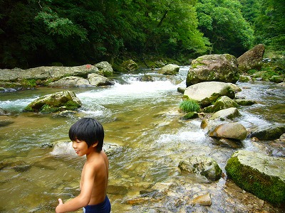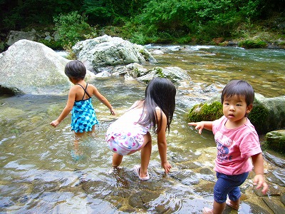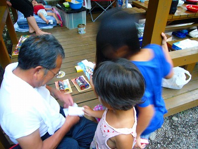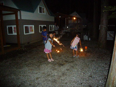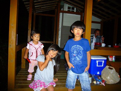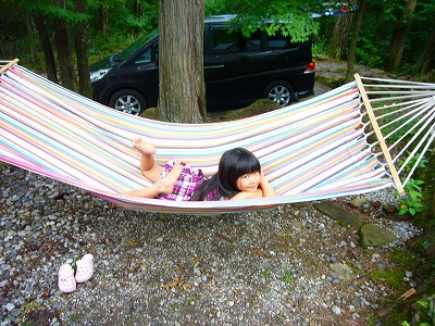 今回のキャンプは、テントやタープの設営がないので、結構気楽です。 そんな余力を使って、自宅から持参したハンモックを設置します。 なかなか好評♪ 室内で使用するより、やはり快適でした。 キャンプ場には川もあります。 結構本格的な川遊びができそう。 cocoも、川の冷たさなどものともせず、しっかりと遊びマシタ。 今回、お義父さんとmmのお姉さん家族と一緒でした。 その、お義父さんプレゼンツの”宝探し”も開催。 番号の書かれた紙を探し、景品と交換してもらいます。 駄菓子屋みたいデス。 さぁ夜は定番の花火。 隅っこのサイトなのと、曜日が木金という事もあり、 近隣のサイトに他の客がいないので、きがねなく遊べマシタ。 そんなこんなで、家族が5人になって初のキャンプ♪ 色々遊んで、食べて、子供達が大興奮のウチに終えれた、大成功のキャンプとなりマシタ。 ・・・来月またイクヨ♪