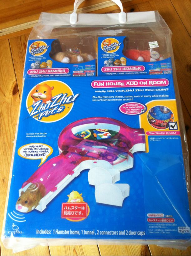 homaばっかりじゃ、可哀想なので。ピアゴの玩具売場を、harucocoの玩具も物色。で、見つけたのがコレ。「ズーズーペット!」何年か前アメリカでバカ売れして、意気揚々と日本に乗り込み、撃沈?したんじゃないかという玩具。ハムスター2体と部屋1つで、500円。バカ安。cocoも大興奮。でも、ネズミ嫌いのmmには大不評。