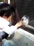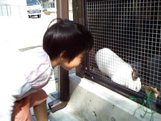 homaのサッカーの送りにharuがついてきた。 プリキュアの放送時間なのにメズラシイ。 目当ては、カメにエサ! ・・・。カメではなくサッカーに行くのですが・・・。 サッカーの練習場である、某小学校へ着く。 !小学校なら! いた!うさぎ!(1羽だけど。。。) 見つけるやいなや、「こいこいこーい。」とウサギを呼ぶharu。 ウサギ使いのようだ。 幼稚園でも見慣れているが、興味津々。 エサはといえば、昨日のお好み焼きの残りのキャベツ! ハグッ カメにエサはあげれなかったけど、haru大満足のお出掛け♪