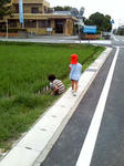 haruちんの幼稚園のお迎えに行く。 幼稚園の近くの田んぼを覗くと、足の生え始めたオタマジャクシ発見。 車のトランクに網とカップ(水草購入した時の物で、密封できて軽量なので重宝!)が常備されているので、試しに捕まえてみる。 田んぼに落ちそう・・・。 うちのカエルプラントのオタマは足生えてたかなあ? だいぶ大きくなったけど。。。 ん?畦道付近にピョコピョコ動く物体を大量に発見。 カエルだ! しかも小さっ。小指の爪くらい。うじゃうじゃ~。 カワイー。 2匹Getし、持ち帰り。 でもppはカエルは触れないのだ。