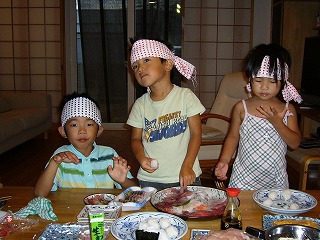 ホントはシャリの握りまで任したいのですが、それだと床がご飯粒だらけにナリマス♪ 予め親がシャリだけ握って皿に並べ、それを子供がネタと握り直す。とすると、被害は最小限に♪ サマーカップご苦労様デシタ。 「助かりました」なんて言われると照れますねー。いやー素直に嬉しいです♪ お礼に出前を・・・え!?埼玉でしたっけ?グハッ!!