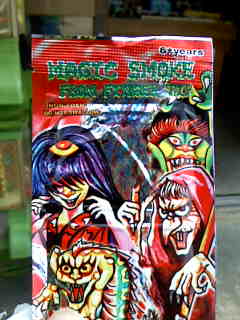 homaharu達が買い物中に、実はppも買い物♪ お目当ては、”おばけけむり” 子供の頃、指につけてこすると煙が出てくるヤツ。 まだあるのかなー !発見~! 10円。外国製。日本製よりも容量が多いのでこっちに。 この安っぽいオドロオドロしいのがタマらんす。 早速、子供の前でやってみる。 やはり好評! いつの時代も子供が好きなものは変わらないのね。 homaもやってみる。簡単簡単♪ 写真に写らん・・・。 昔と値段が変わらないのがウレシイね。