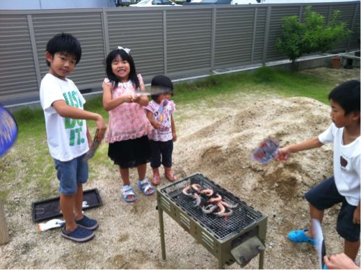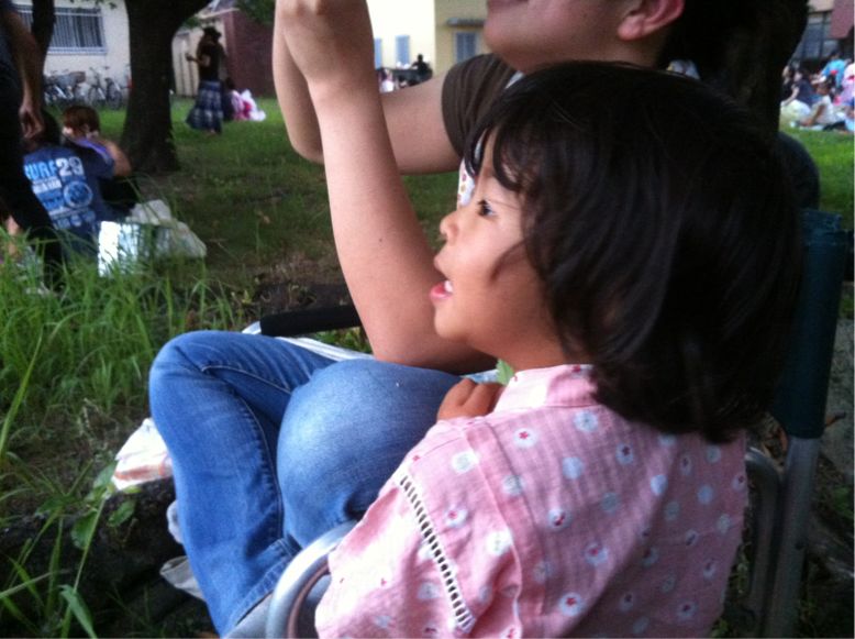 cocoに花火を見せてあげたいと思い、久々の岡崎の花火大会に行きました。以前は実家が岡崎の六名だったので、実家から見る事ができていましたが、今は刈谷で同居。なので、駐車場所から観覧場所まで確保が必要。しかし、そこは流石に元地元民。勝手知ったるなんとかで~なんとか上手い事やれマシタ。早目の到着なので、観覧場所に併設の公園遊具が子供らに大活躍。homaharuも久々の花火に興奮気味。二人だけで手をつないで仕掛け花火を見に行ったり、写真のように常により添いながら見学したり。恋人か。さて、初花火のcocoちん。開始前の空砲にはビビってましたが、いざ花火が上がると、「キレイね~。」を連呼。喜んでくれた様子♪帰りは早目の8時撤収。cocoが寝たので。。。この時点で「コムタウン」横の道路は凄まじい渋滞。安易に止めると大変な事になりマス。そいつを尻目にするっと帰宅。疲れたけど、楽しかった♪子供らも楽しかったって。