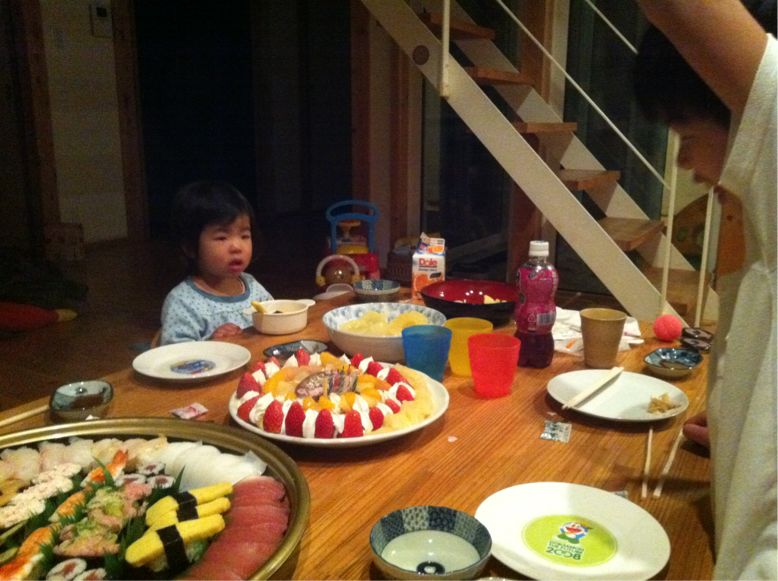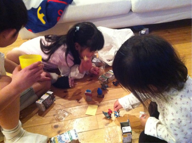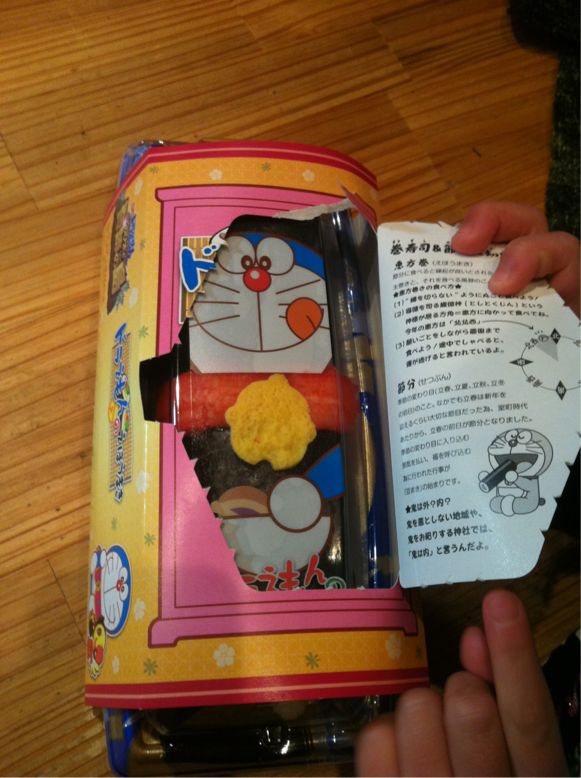 ちょっと古い話ですが、節分の日。cocoが怖がりそうなので、豆まきは中止。代わりと言うか~☆ドラえもんの恵方巻イオン限定販売。わざわざmmがイオンまで買いに行ってくれマシタ。外装のどこでもドアを開けると、ドラちゃん♪一本600円くらいしたので、一人一本とまではいかず、coco分を切り分け。北北西を向いてかぶりつき。初めて恵方巻食べたけど、楽しかった。
