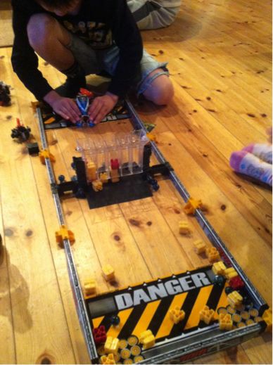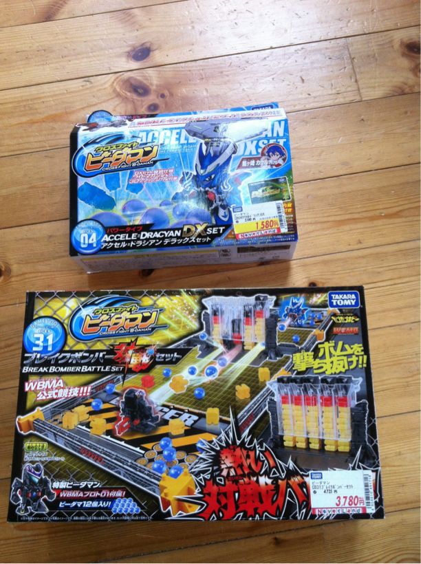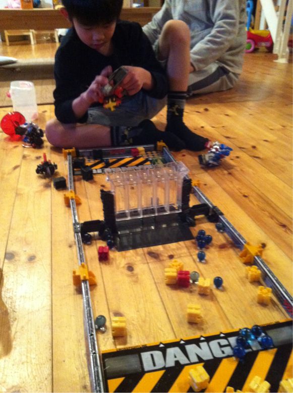 homa9歳の誕生日プレゼント。☆ブレイクボンバー☆アクセルドラシアンブレイクボンバーは、2月4日発売。5日の日曜にエイデンに買いに行ったら最後の一個。早速組み立て。昼ご飯食べるのも忘れています。男の子だねぇ。女の子達も興味深々。cocoも良くビー玉飛ばして遊んでマス。ブレイクボンバーは、囲いの中で・・・このブロックを、お互いの陣地からビー玉を打ち込み、相手の陣地へ押し込みマス。赤いブロックを3個押し込んだ方の勝ち。赤ブロック狙いの駆け引きなんかもあり、なかなか燃えますね。柵が紙製なのと、ビー玉があちこち飛び散るのが、チョット。ppも買っちゃいマシタ。