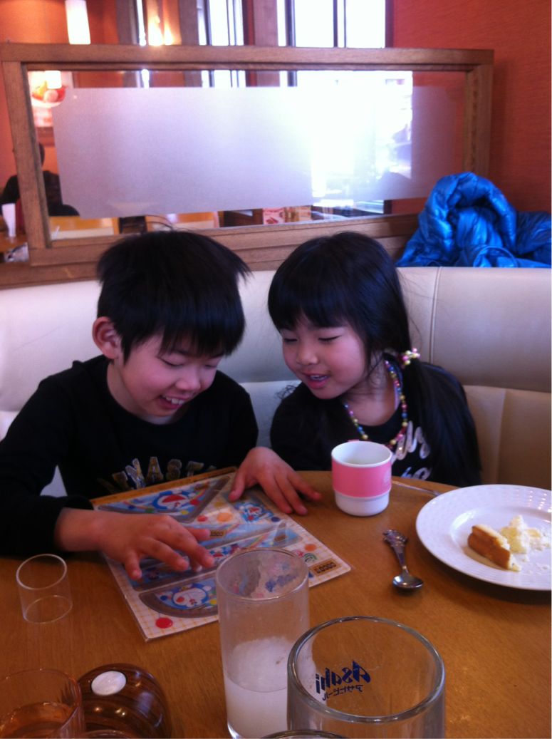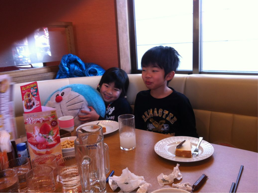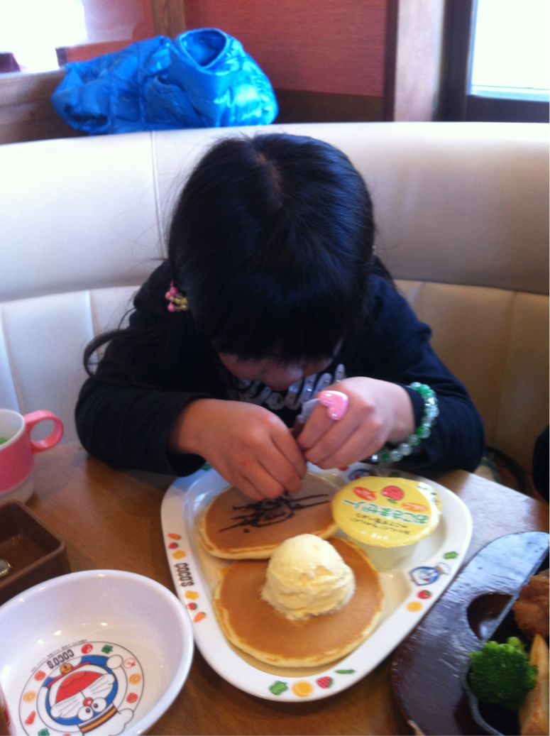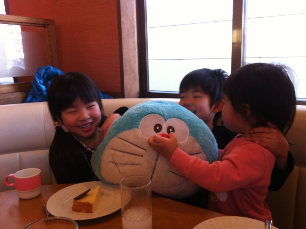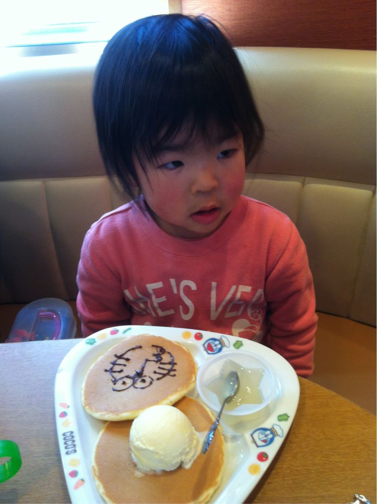 homaharuの誕生日の中日の今日、久々に阿久比町のココスへ来ました。cocoの出産直前だったかな。実はcocoの名前の決定にココスが一役買っています。5人家族だと、コーナー席座りやすい様子。ソファー快適デシタ。皆思い思いに注文。homaのトリオもすごいボリューム。cocoには、ドラえもんを愛してやまないppによるドラえもんホットケーキ。haruも頑張って自分で、ドラえもんを描いてみます。今回この時期にココスに来た目的は、お誕生日サービスデス。お店の方に誕生日の事を伝えると、デザートのサービスと写真撮影、ドラえもんグッズが頂けます。突然のドラえもんの登場に、cocoも大はしゃぎ。頂いたドラえもんグッズは、定規セット。初めてこういうサービスを受けました。いつもラーメン屋を連れ回されている子供達。喜んでくれたようです。