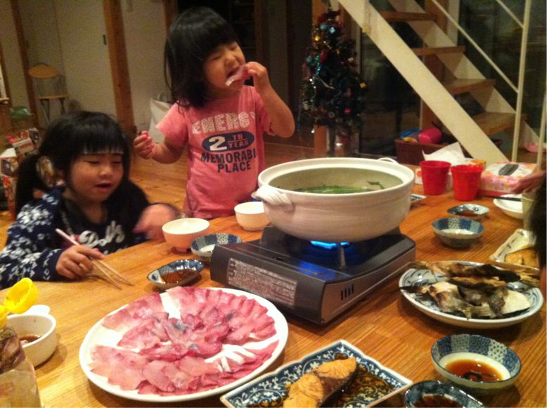 会社からの年末支給品として、毎年魚を貰っています。(変わった会社デス。)去年までは鯛だったのですが、今年はブリ!一人身の上司から、もう一匹頂いてるので、計二匹!とても食べ切れないので、お婆ちゃん家やご近所にも配りマス。一度やってみたかった「ブリしゃぶ」が実現!子供達も大喜び♪半身残しておいたら、翌日の晩御飯もブリしゃぶになってしまいマシタ。はは。