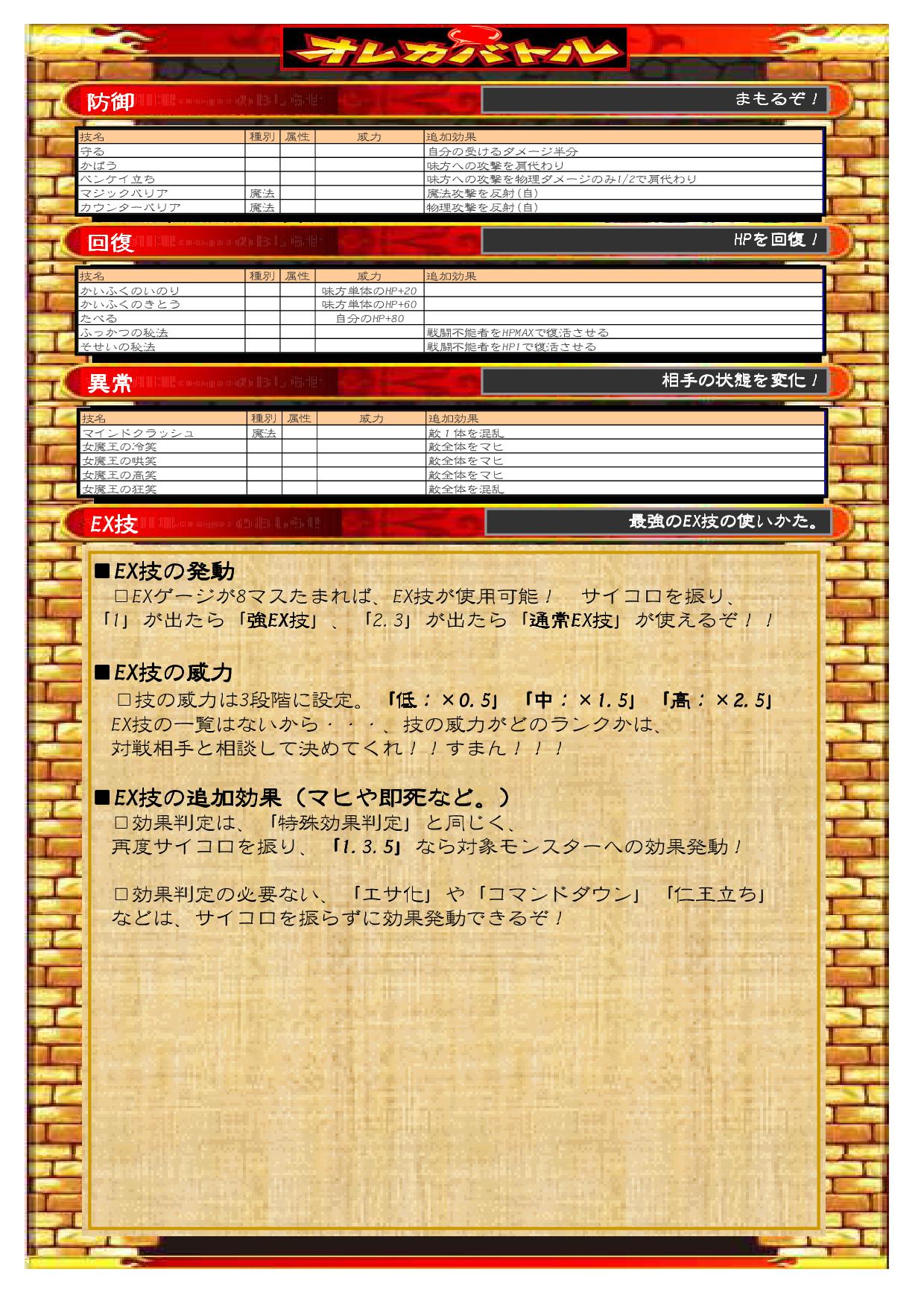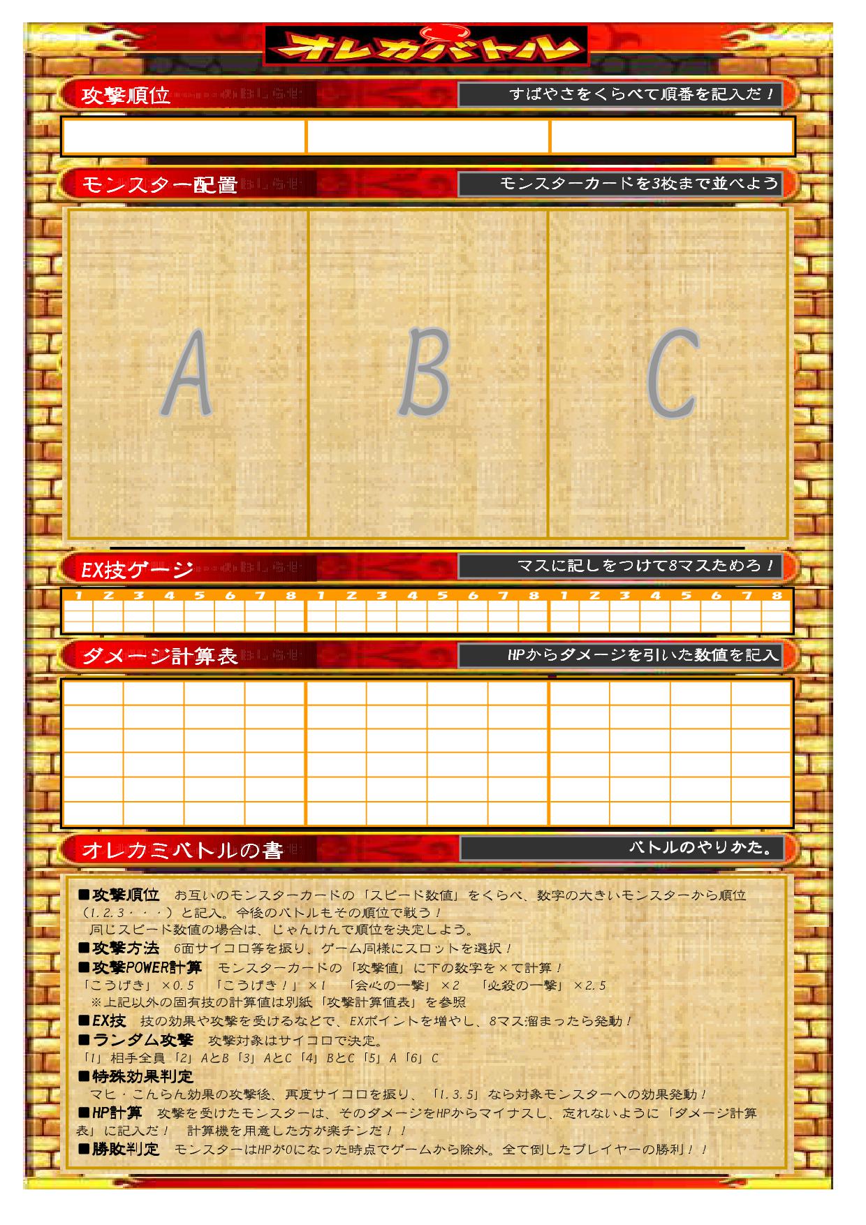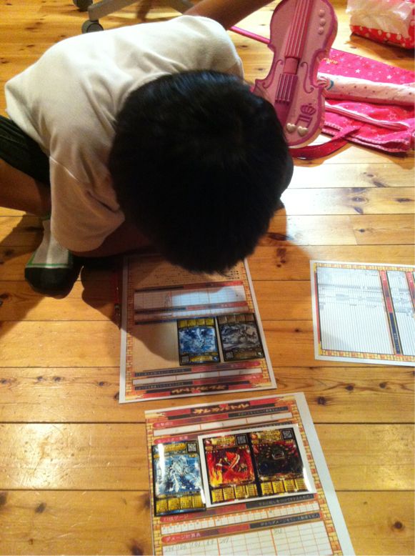 homaが家に遊びに来た友達と、オレカバトルを対戦したかったらしい。 しかし子供の移動可能範囲には、オレカバトルの設置店舗はない。 そこで、彼等が自ら考えて対戦方法を作りあげてました。 こいつにゃあ、ひたすら感心。 ちょっと細部のルール化を手伝い、具現化しマシタ。 コレ! その名も・・・ 『オレカミバトルシート!』 オレカバトル・・・オレカ・・・紙でバトル・・・ オレカミバトル・・・。 まぁ名前は良しとして、早速play! HPや攻撃威力など、計算がちょいと大変ですが、なかなか燃えマス。 必要なものは、 ■オレカミバトルシート ■筆記用具 ■計算機 ■オレカのカード ■サイコロ 各固有技などの威力や効果などは、コイツを参照。 子供の計算能力向上も見込める?